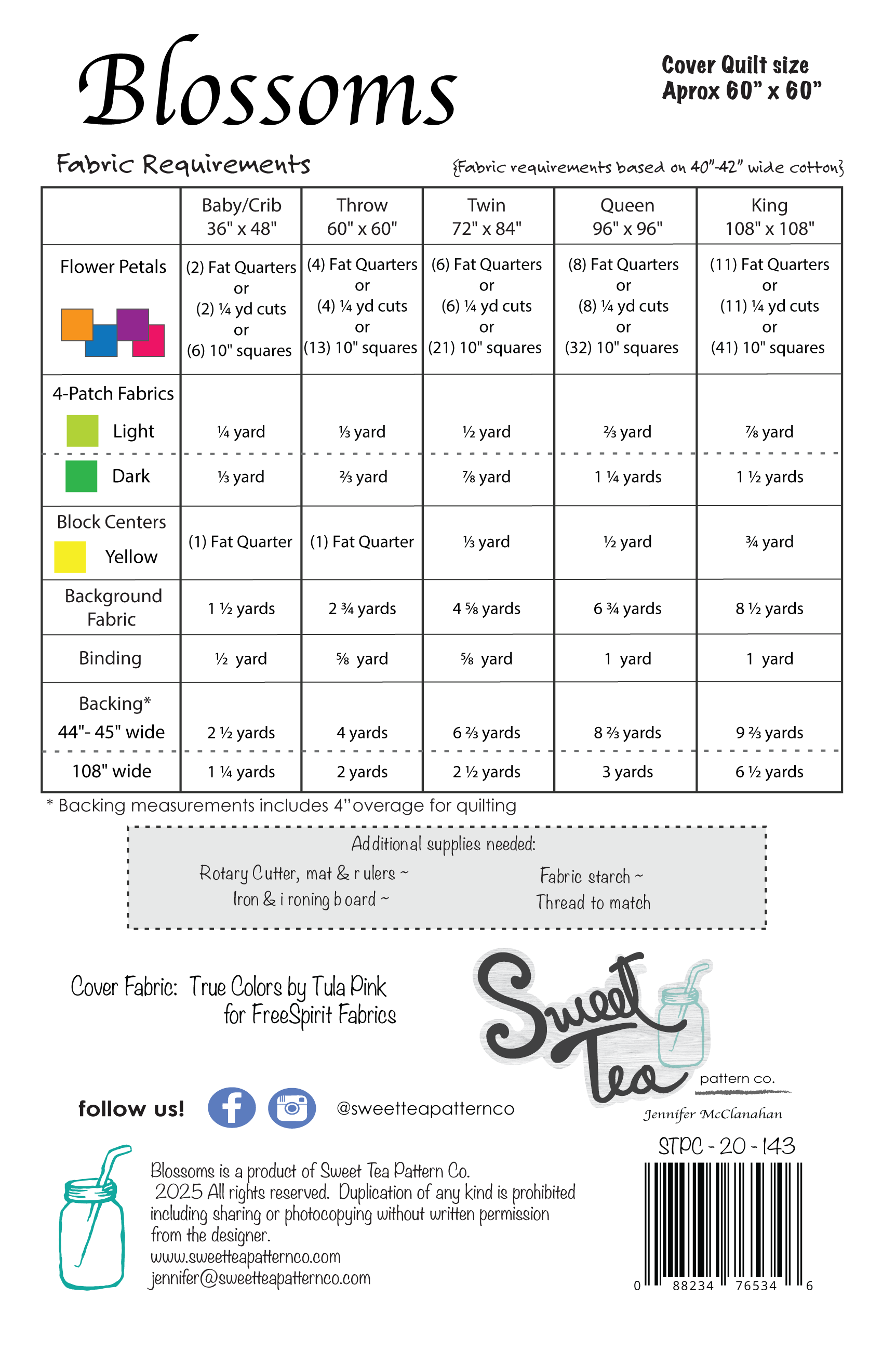 Bring a touch of timeless charm to your sewing space with Blossoms—a delightful quilt that combines piecing and appliqué techniques. This fat quarter–friendly design lets you showcase your favorite florals and prints. Just add a few greens and some cheerful flower centers, and you’ll have your own garden of forever Blossoms—no watering required!