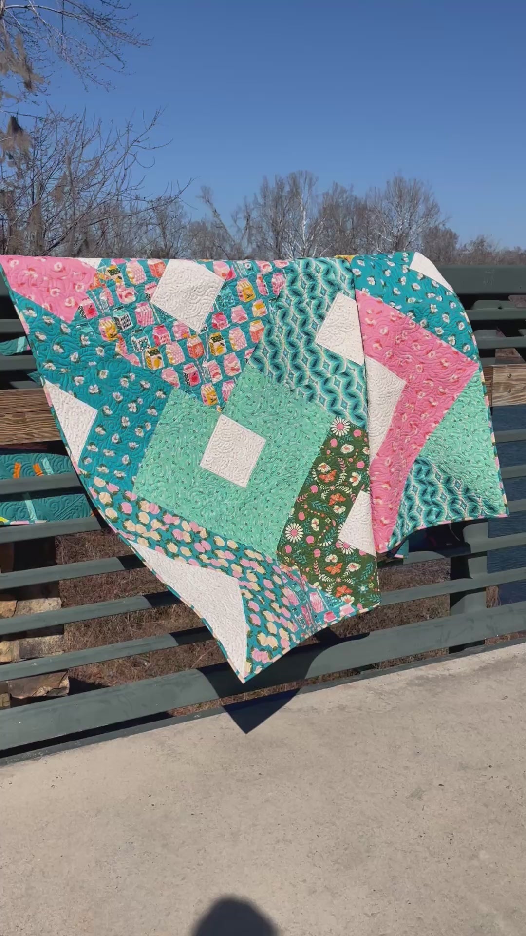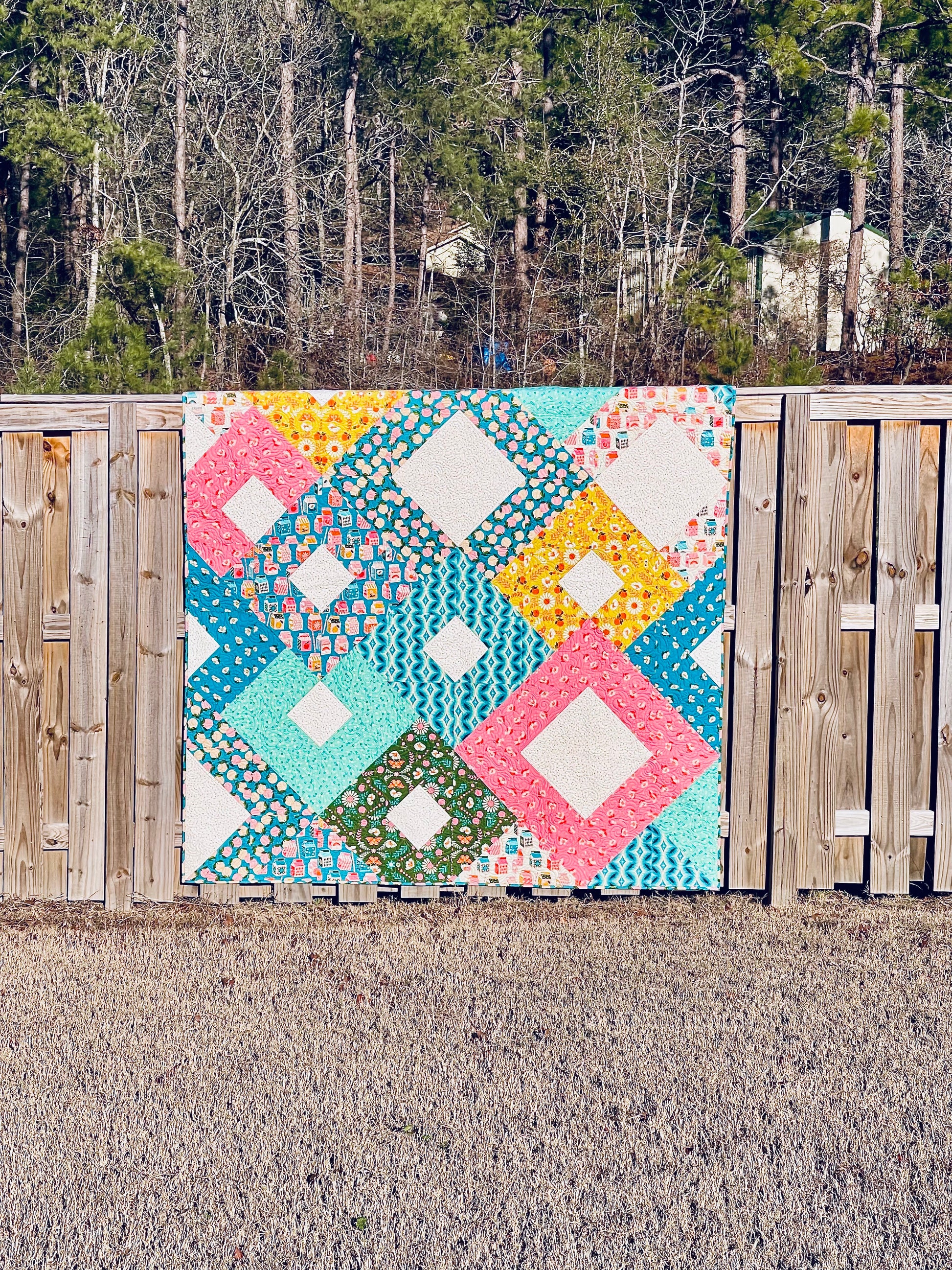 The design features bold, oversized diamond blocks that let your fabrics shine. It is the perfect pattern for showing off favorite prints, mixing florals and geometrics, or even pulling from your stash. The layout looks impressive, but the construction is straightforward and satisfying to sew.